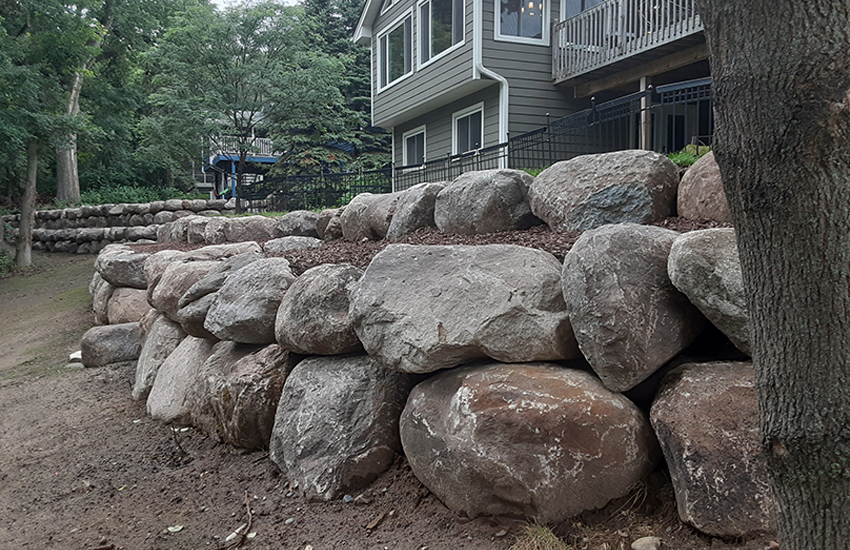 Boulder retaining wall design and construction by Landscapes Unlimited in Minnesota